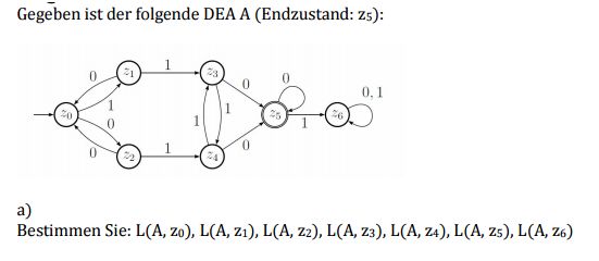 Es wäre \( L(A, z_5) \) die Sprache, die nur Wörter bestehend aus \( 0 \)en und das leere Wort enthält.